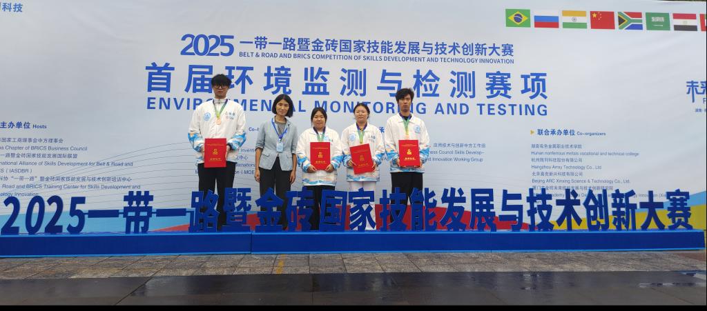 2025 年 10 月 17 日至 19 日,一带一路暨金砖国家技能发展与技术创新大赛首届“环境监测与检测赛项” 在湖南有色金属职业技术学院成功举办。我院食品园林学院环境工程技术专业学生丁思杞、张欣怡与袁帅、朱涵坤分别组成两支参赛队伍,与来自全国的210支高职组队伍同台竞技,最终凭借扎实的专业知识储备与稳定的临场发挥,两支队伍均荣获赛项铜奖,指导教师齐丽彬、高晓松也在赛事过程中积累经验、受益匪浅。