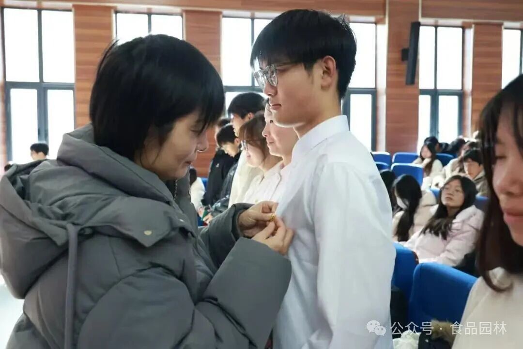 仪式在激昂的国歌声中拉开序幕,全场肃立,歌声嘹亮。团总支书记卫婕郑重宣读了2026年度新发展团员名单,每个被念到的名字都承载着组织的期许与信任。在庄重的氛围中,与会领导为新团员代表佩戴上闪亮的团徽,颁发团员证。团徽在胸前熠熠生辉,新团员们眼中闪烁着坚定与自豪。