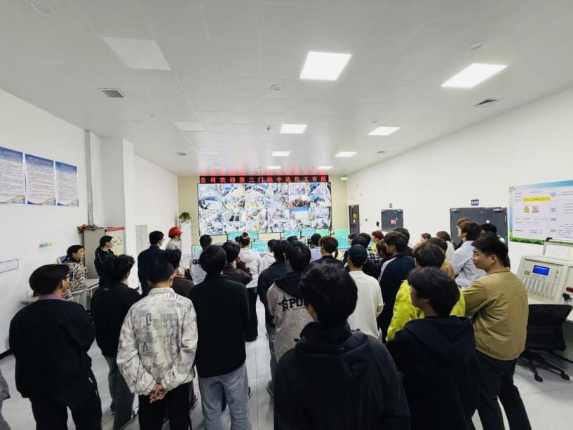第二站抵达三门峡中达化工有限公司,作为国家级专精特新“小巨人”企业,中达化工深耕稀有金属萃取剂与塑料助剂领域。在生产车间,技术工程师详细讲解了萃取剂在湿法冶金中的应用原理,重点介绍了企业在产品纯度控制等方面的核心技术。同学们认真观察萃取反应釜、精馏塔等设备的运行状态,对化工生产的标准化操作与精细化管理有了深刻理解,拓宽了行业视野。